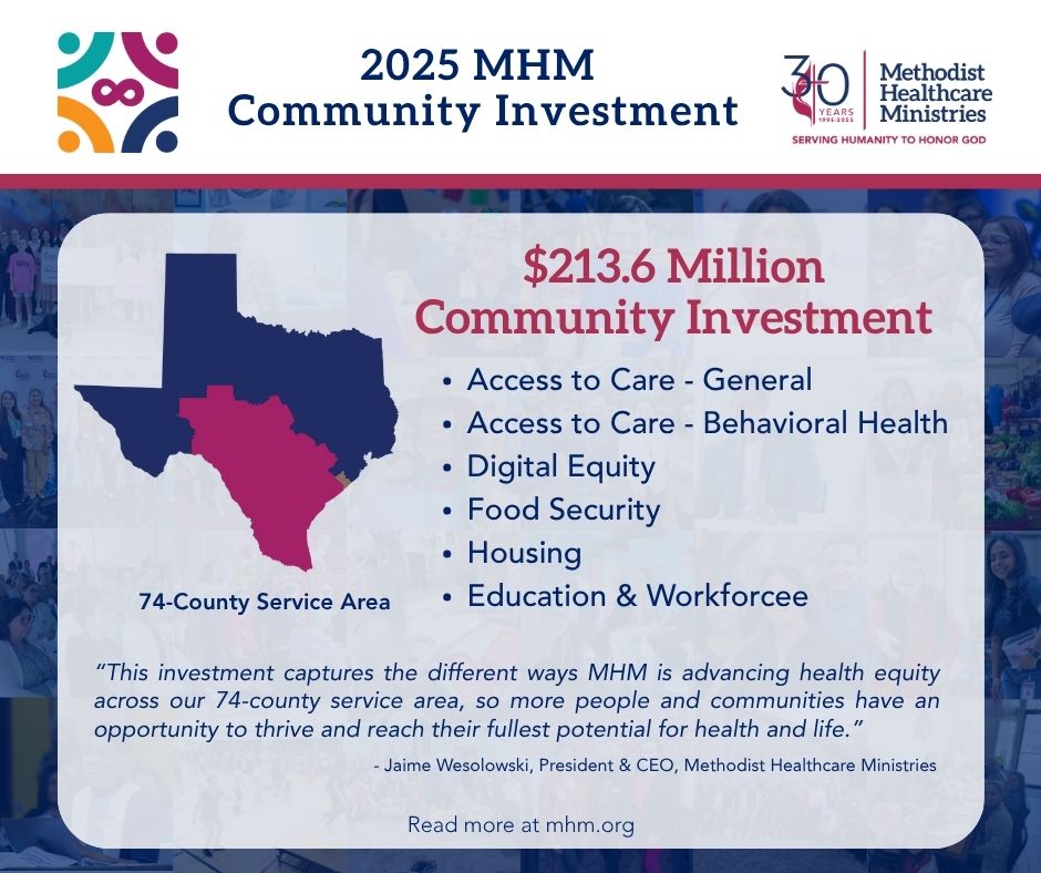 San Antonio, TX, June 27, 2025 (GLOBE NEWSWIRE) -- (San Antonio, TX, June 20, 2025) – In 2025, Methodist Healthcare Ministries of South Texas, Inc. (MHM) is investing nearly $214 million to advance health equity, strengthen communities and drive systemic change across its 74-county service area. This amount includes funding for direct services, community investments, the development of community partnerships, and advocacy initiatives that create a more level playing field for individuals to thrive. The organization’s 2025 commitment represents an increase of 18 percent from its 2024 investment.