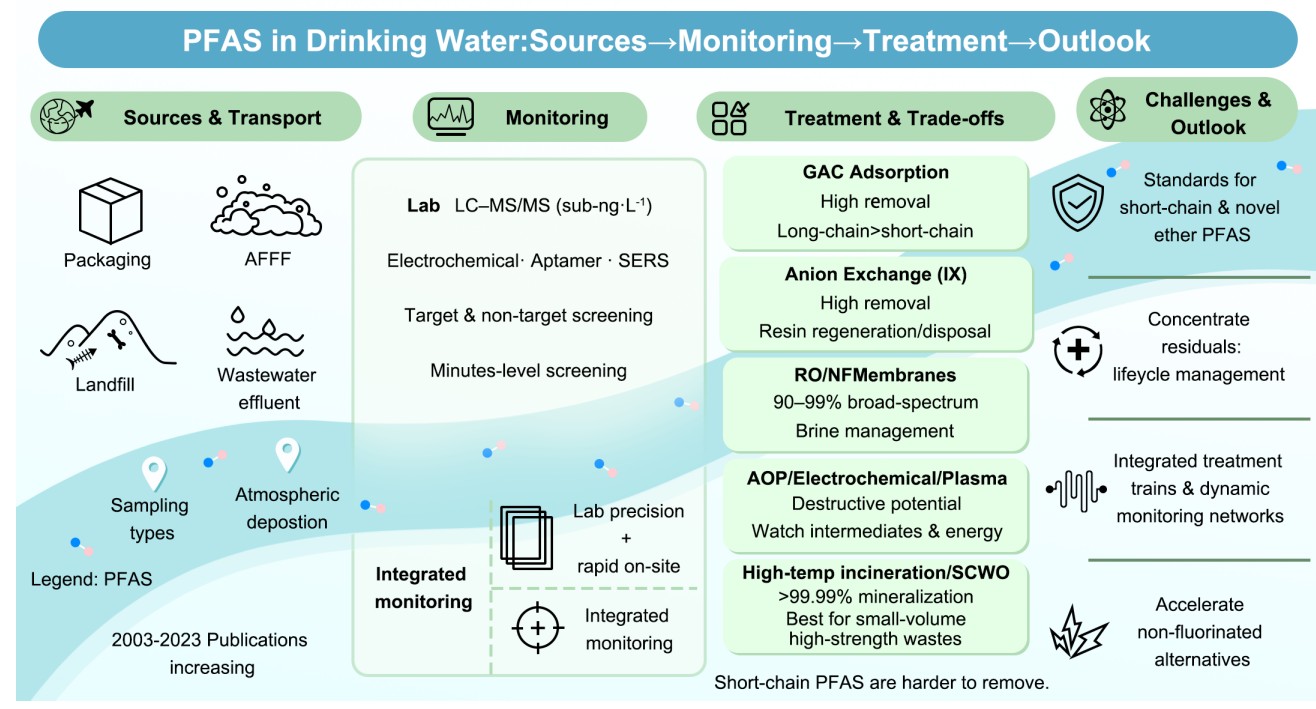 The study also provides an overview of PFASs’ sources, transport, analytical detection, and mitigation in drinking water. Major pathways for PFASs’ entry into water sources include surface runoff, soil leaching, and atmospheric deposition. While traditional analysis relies on liquid chromatography–tandem mass spectrometry, new portable high-selectivity sensors are emerging. Current removal strategies such as activated carbon, ion-exchange, membranes, and advanced oxidation processes, involve notable cost-performance trade-offs.